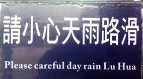 例如,上圖的英文就完全沒有起到提示作用,「路滑」直接音譯 Lu Hua,外國人根本看不懂。這個標語目的是要提醒路人下雨天路很滑,小心不要滑倒,因此可以翻譯為Caution slippery on rainy days。