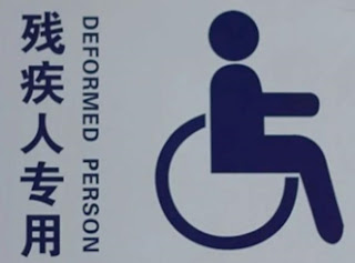 例如上圖這個標語,中文和英文的用詞都欠妥。關於身心障礙者的中英文用詞都會比較敏感,因為詞語的誤用容易造成對身障者的歧視。在這裡先不討論該標語的中文用詞,其英文用詞Deformed Person意思是「畸型的,扭曲變形的」,改詞過於貶義,並且「身心障礙」與「畸型的」意思也不對等。另外,也有看到身障者的用詞是handicapped(有缺陷的)或者disabled(無法作用的),雖然意思大致無誤,但這兩個詞還是有「殘缺的」這種不客氣的意味。目前最恰當的用詞應該是physically challenged people/person,字面意思就是「身體方面受到挑戰的」。