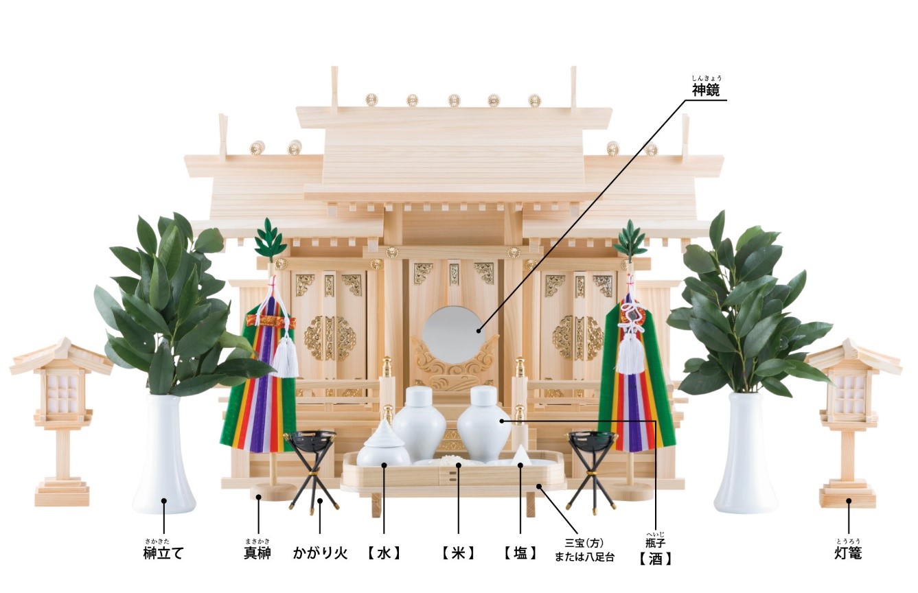 - 「神符」(日語:御札;御 ( お ) 神 ( ふ ) 符 ( だ ) ),位於圖中神鏡正上方可以看到有一張符的位置。將從神社求得的神符供奉於家中祭拜,以伊勢神宮內宮的神符「神宮大麻」(日語:じんぐうたいま)為代表。因為伊勢神宮內宮祭祀的是日本最崇高的天照大御神,為全日本神社的總鎮守。