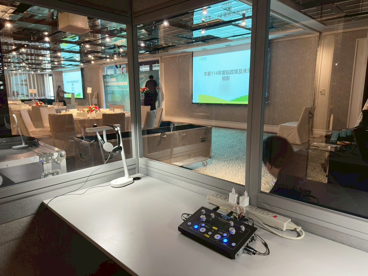這是從口譯隔間內部望出去的視角,三面皆為透明工作窗,讓口譯員能清楚掌握會議現場的情況,不會有視線死角的問題。隔間內配有工作桌、閱讀燈、循環風扇換氣系統,以及LED訊息顯示板,設備齊全,能確保口譯過程中音訊穩定清晰,不易受到干擾。