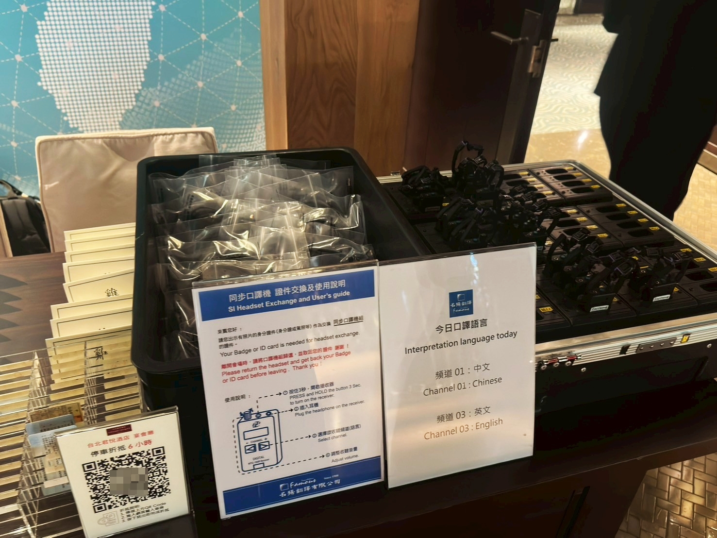 會場入口設有口譯設備租借處,與工作人員出示證件後即可領取口譯機。調整頻道至對應語言後,便能即時收聽現場口譯內容,方便來賓依需求選擇語言服務。
