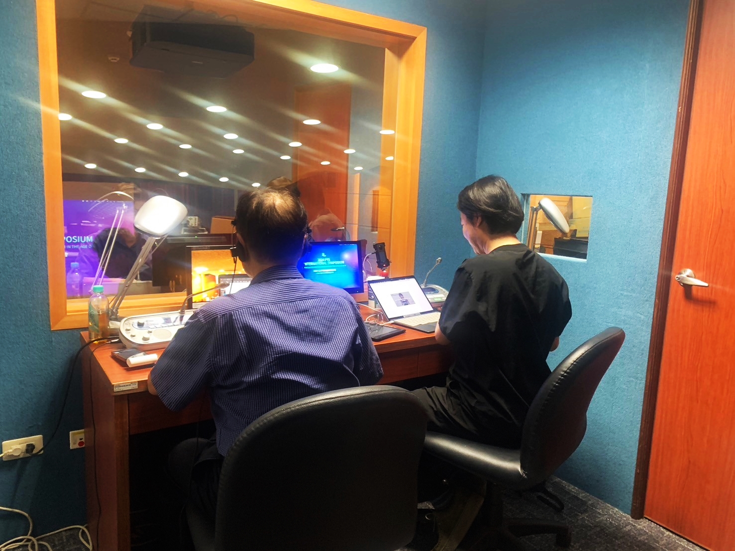 台大霖澤館附有口譯間,所以不用另外租借口譯廂/口譯隔間(Booth),口譯機館內也有提供,所以我們只需要派口譯員到場即可。兩位口譯員正進行同步口譯工作,因為工作坊的日程是從早到晚,所以需要兩位口譯員輪流口譯(一人約15~20分鐘),這樣才可以確保翻譯品質不因疲勞而受到影響。