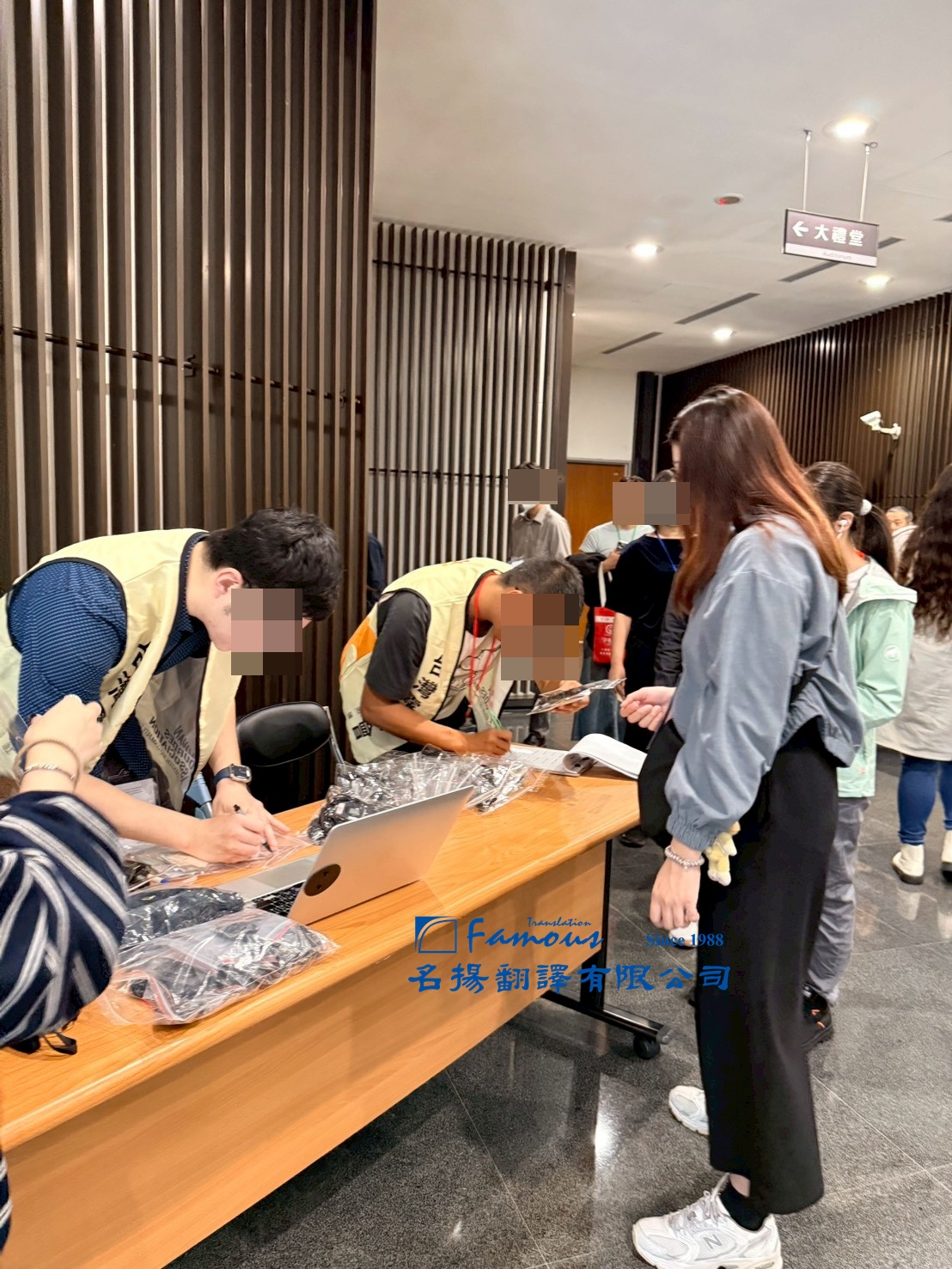 會場入口規劃口譯接收機領取區,設備發放可由客戶工作人員執行,或交由名揚團隊安排專業人員協助,讓與會者能夠快速領取,輕鬆入場。