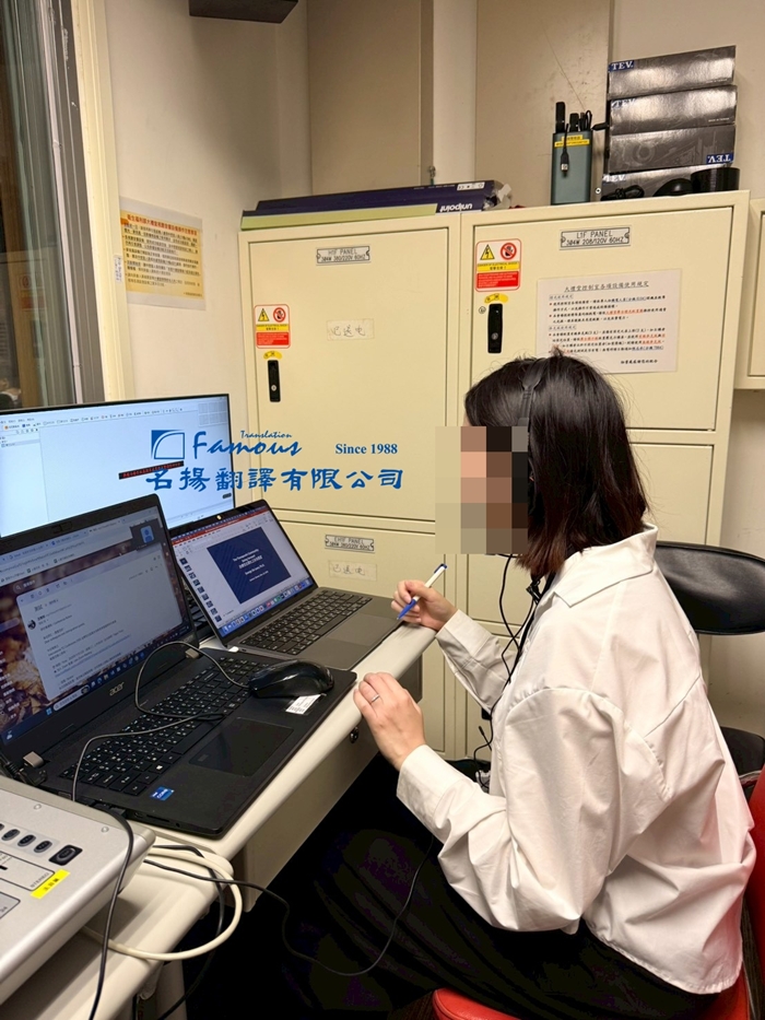 照片是同步口譯員於中控室內執行口譯的樣子,口譯員可以一邊監看會場畫面一邊進行同步即時口譯,隨時掌握會議流程。